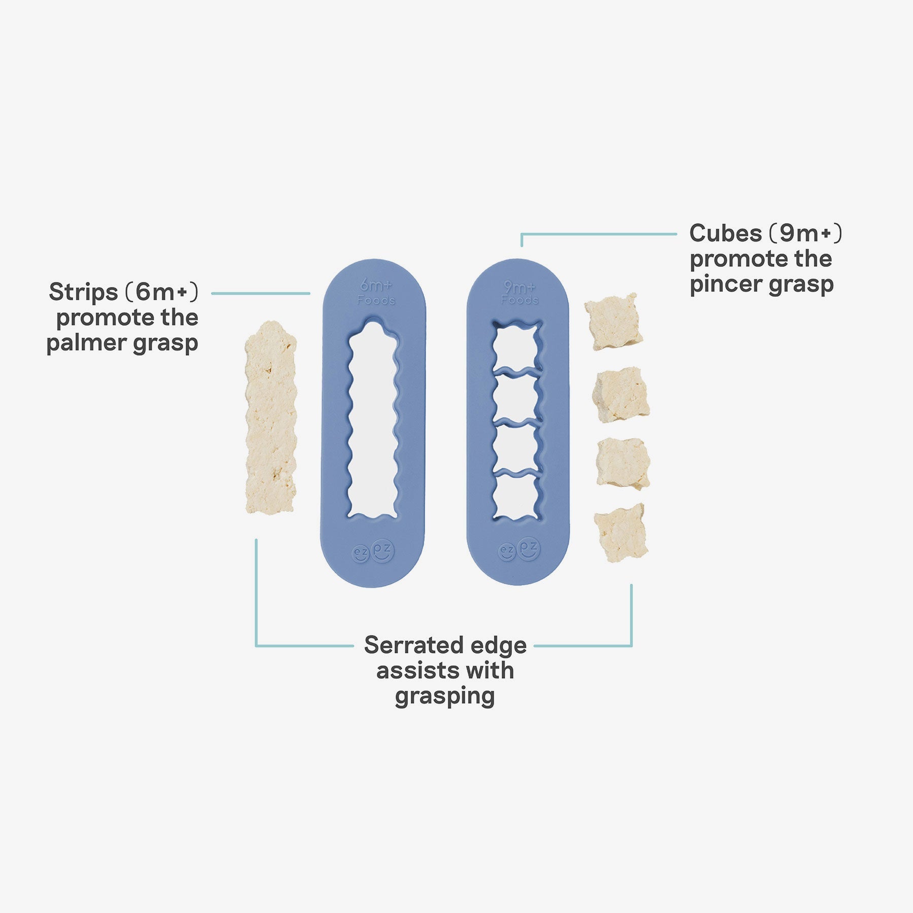 The ezpz food cutters make baby-led weaning food prep ezpz! Start with the food cutter for food strips (6m+) to promote the palmar grasp. At 9m+ layer in the cubed food cutter to promote the pincer grasp.